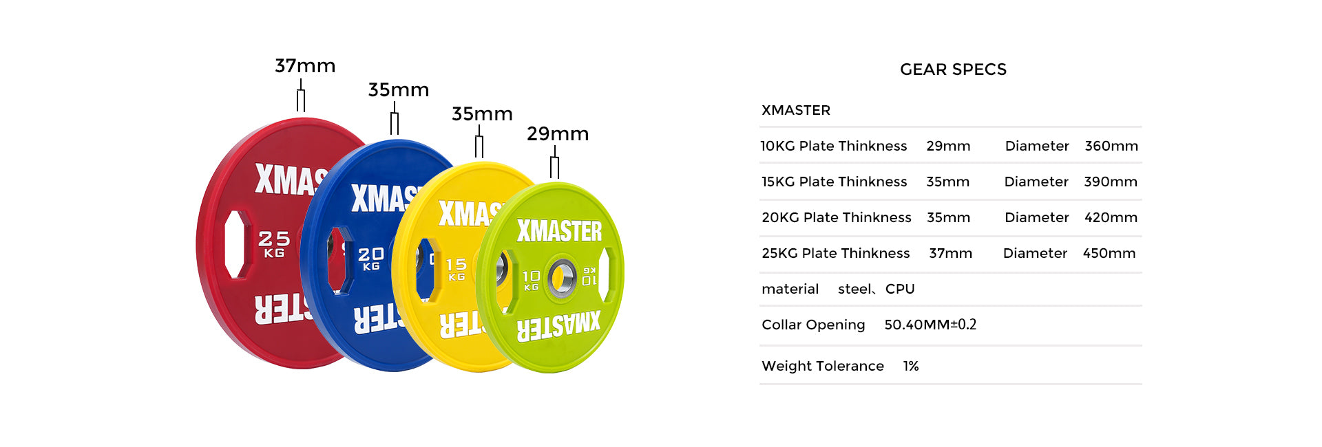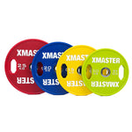 Les disques XMASTER en acier chromé (20 kg, 19 mm d'épaisseur) présentent une conception mince et compacte pour un rangement et un transport faciles, tandis que les disques XMASTER en uréthane avec poignée (20 kg, 35 mm d'épaisseur) offrent une construction plus épaisse et ergonomique pour un confort accru et une meilleure protection du sol.